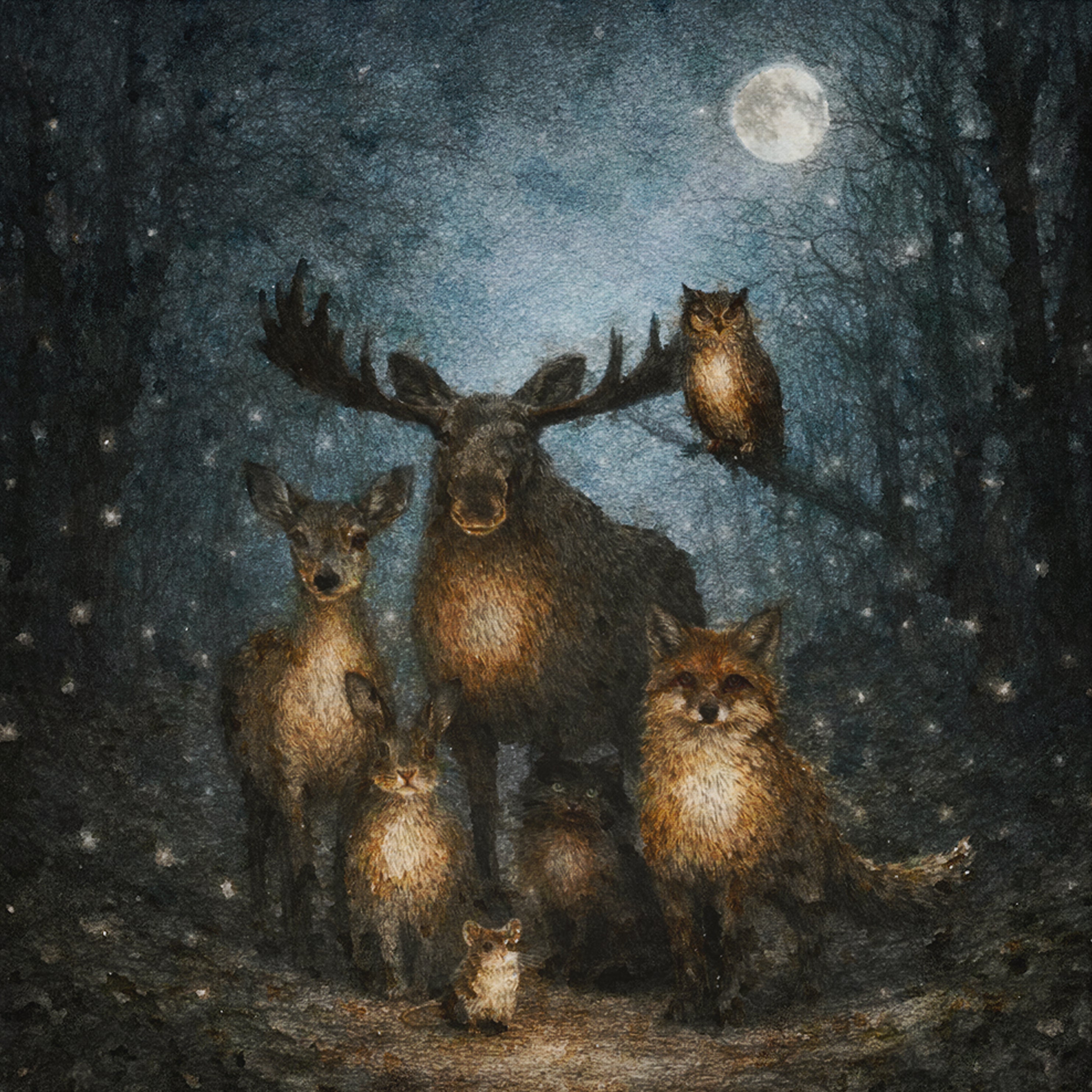 Här finns räven som rör sig tyst mellan rötterna, ugglan som ser i mörkret, haren, rådjuret, älgen, katten och den lilla musen. Alla bär de sitt eget lilla ljus. Alla hör de hemma här.